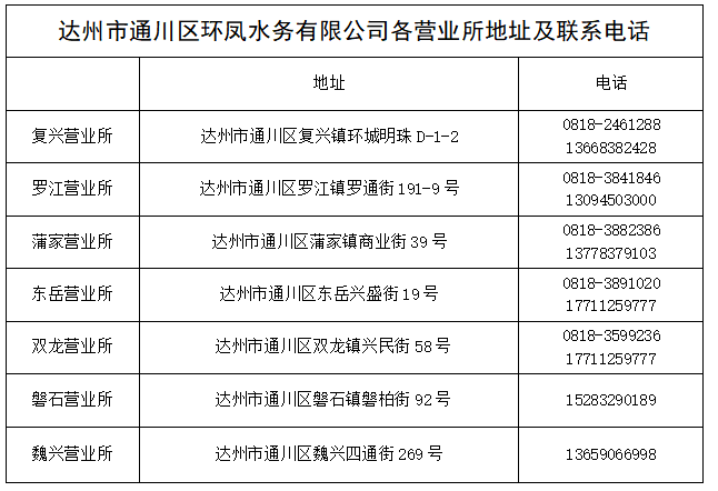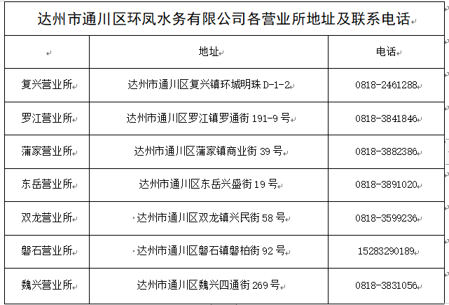 因環(huán)鳳水務(wù)公司(達(dá)州水務(wù)集團(tuán)下屬子企業(yè))營(yíng)銷系統(tǒng)升級(jí),期間暫停開(kāi)具線上水費(fèi)發(fā)票業(yè)務(wù),若需索取水費(fèi)發(fā)票,可在各營(yíng)業(yè)所線下辦理。給您帶來(lái)的不便,敬請(qǐng)諒解。如有疑問(wèn),請(qǐng)聯(lián)系各營(yíng)業(yè)所。